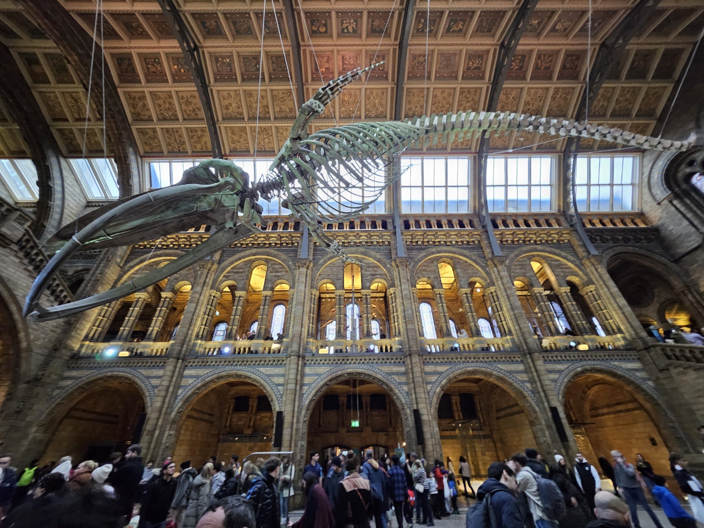 자연사 박물관에 도착하자마자, 건물 자체의 웅장함에 먼저 압도당했다. 빅토리아 시대에 지어진 이곳은 고딕 양식의 건축물로, 거대한 성 같은 외관을 자랑한다. 건물 안으로 들어서자 중앙홀에서 거대한 공룡의 뼈가 우리를 맞이했다. 어른인 내가 봐도 정말 너무 멋있고 신기하다.
