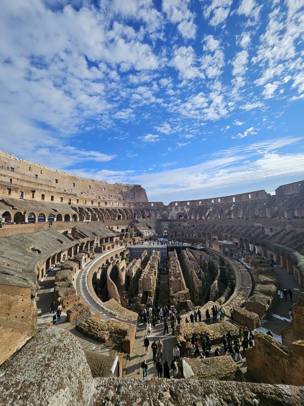 콜로세움 내부로 들어서자 또 한 번 압도당했다. 거대한 경기장의 중앙은 현재 바닥이 일부만 남아 있었는데, 그 아래로는 지하 구조물(하이포지움, Hypogeum)이 드러나 있었다. 이곳은 과거에 검투사들과 동물들이 대기하던 공간이었다고 한다.